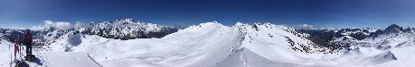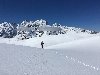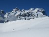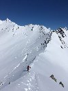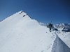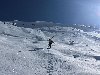 Passem de llarg el cim i enfilem pels pendents directes al cim. A mitja rampa hem de posar crampons perquè amb esquís patinem, hi ha una capa de neu dura a sota d’un dit de neu recent. A peu, aquesta capa es trenca i ens enfonsem, de vegades fins al genoll… hi ha com uns 30cm de neu de les darreres nevades, i per sota neu podridota.